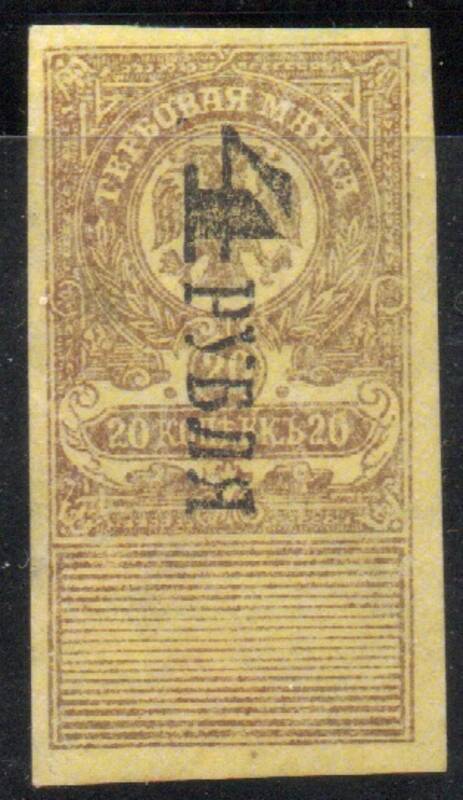 Надпечатка: "4 РУБЛЯ" на 20 коп. 1 марка.