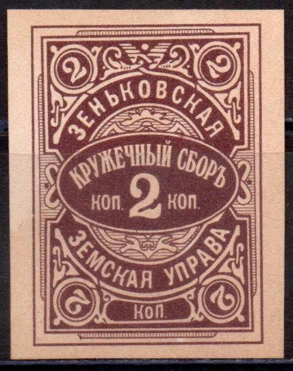 2 коп. лиловая. ЗЕНЬКОВСКАЯ ЗЕМСКАЯ УПРАВА. КРУЖЕЧНЫЙ СБОР. 1 марка.
