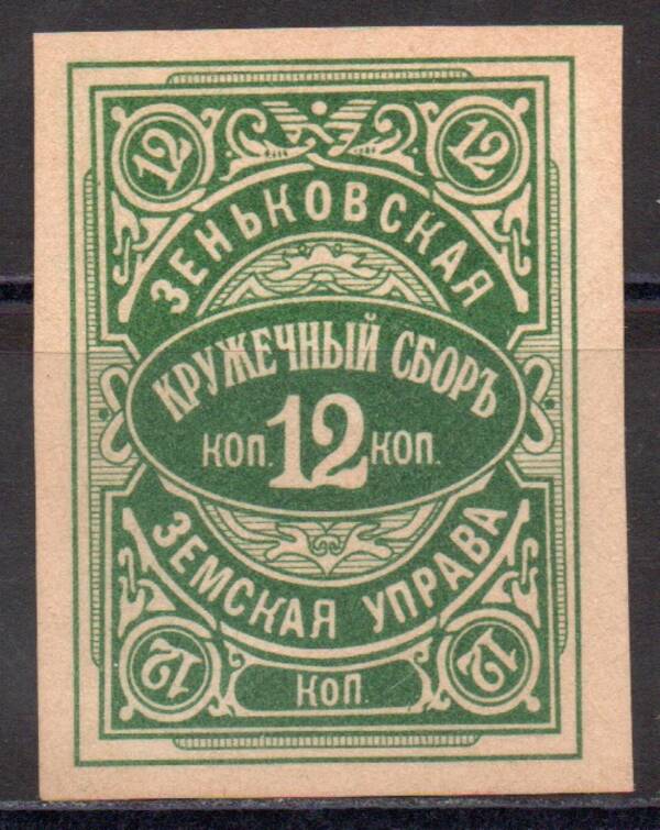12 коп. зелёно-жёлтая. ЗЕНЬКОВСКАЯ ЗЕМСКАЯ УПРАВА. КРУЖЕЧНЫЙ СБОР. 1 марка.
