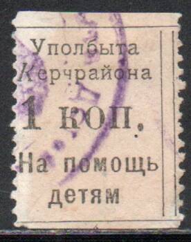 Одноцветная типография. Перфорирована с двух сторон. Размер 20 х 26 мм. Погашена фиолетовым штемпелем. Снята с документа. Часть бумаги от документа на обороте.