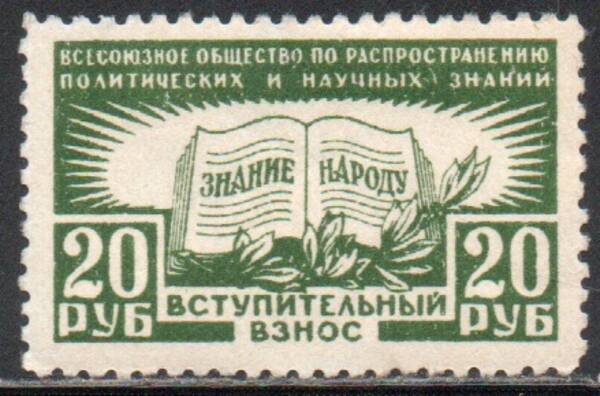 20 руб. тёмно-зелёная. ЗНАНИЕ НАРОДУ. Членский Взнос. 1 марка.