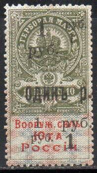 Надпечатка "1 руб. ОДИНЪ Р." и "Вооруж. силы / Юга / России" на 10 коп. 1 марка.